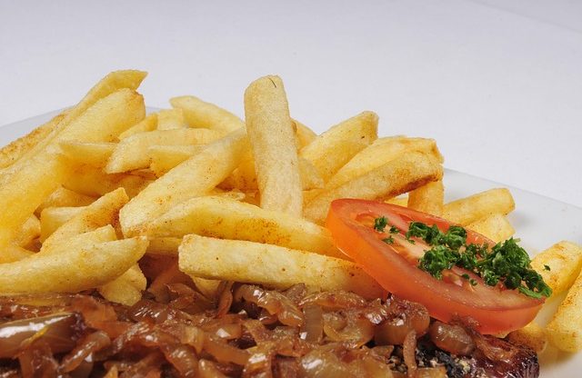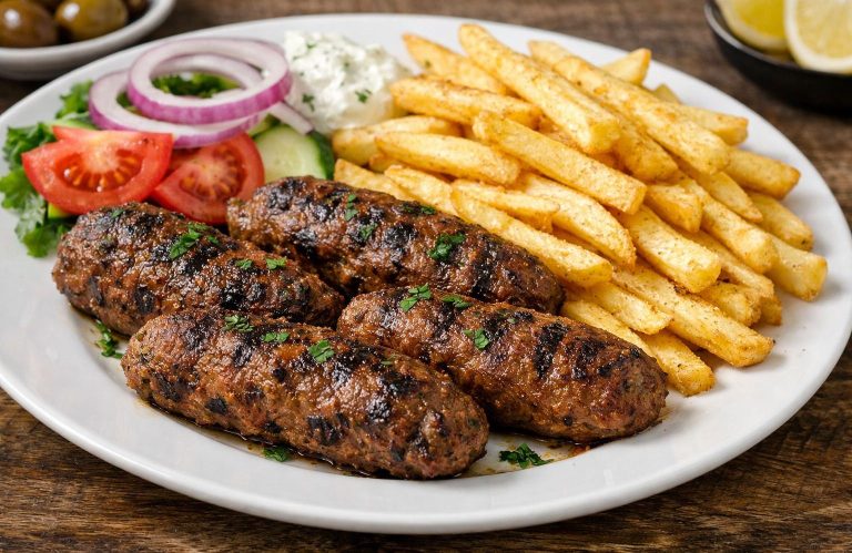 3 Soutzoukaki mit Pommes, Salat, Zwiebeln und Tzatziki