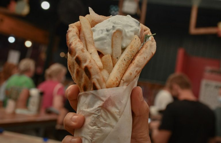 Der griechische Klassiker: Eine Portion Gyros vom Schwein mit Tzatziki.