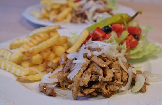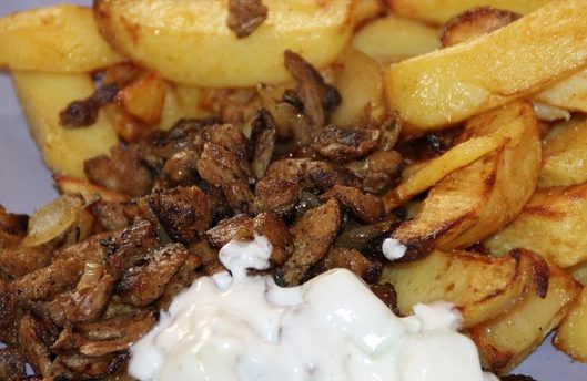 Gyros vom Schwein mit Pommes, Tzatziki und Salat