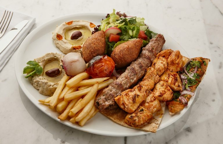 Gyros, Souvlaki, Soutzoukaki mit Pommes, Tzatziki, Salat und Zwiebel