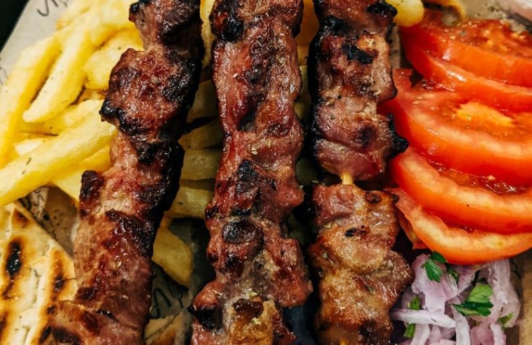 3 Souvlaki mit Pommes, Salat und Tzatziki
